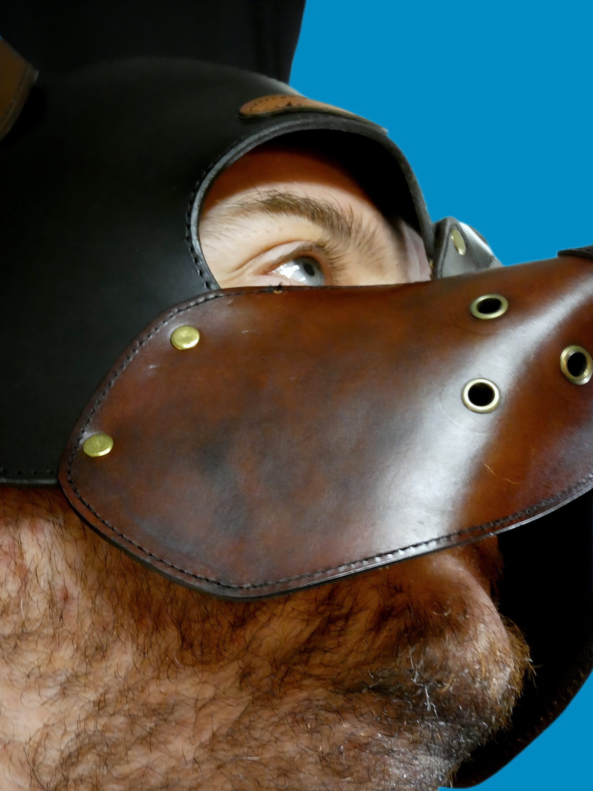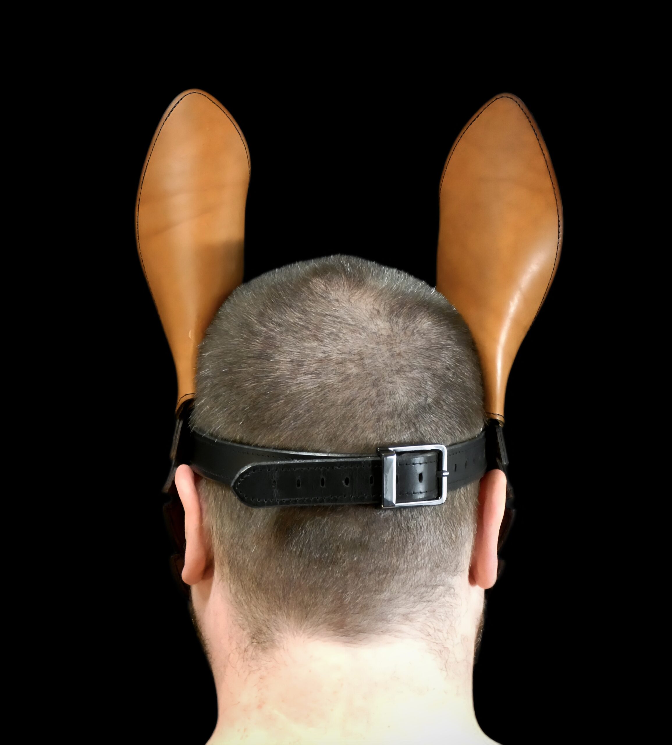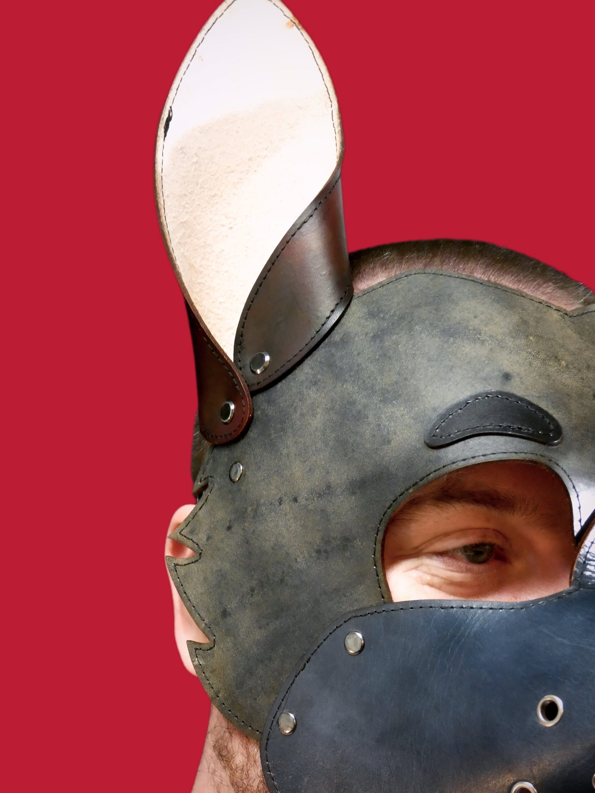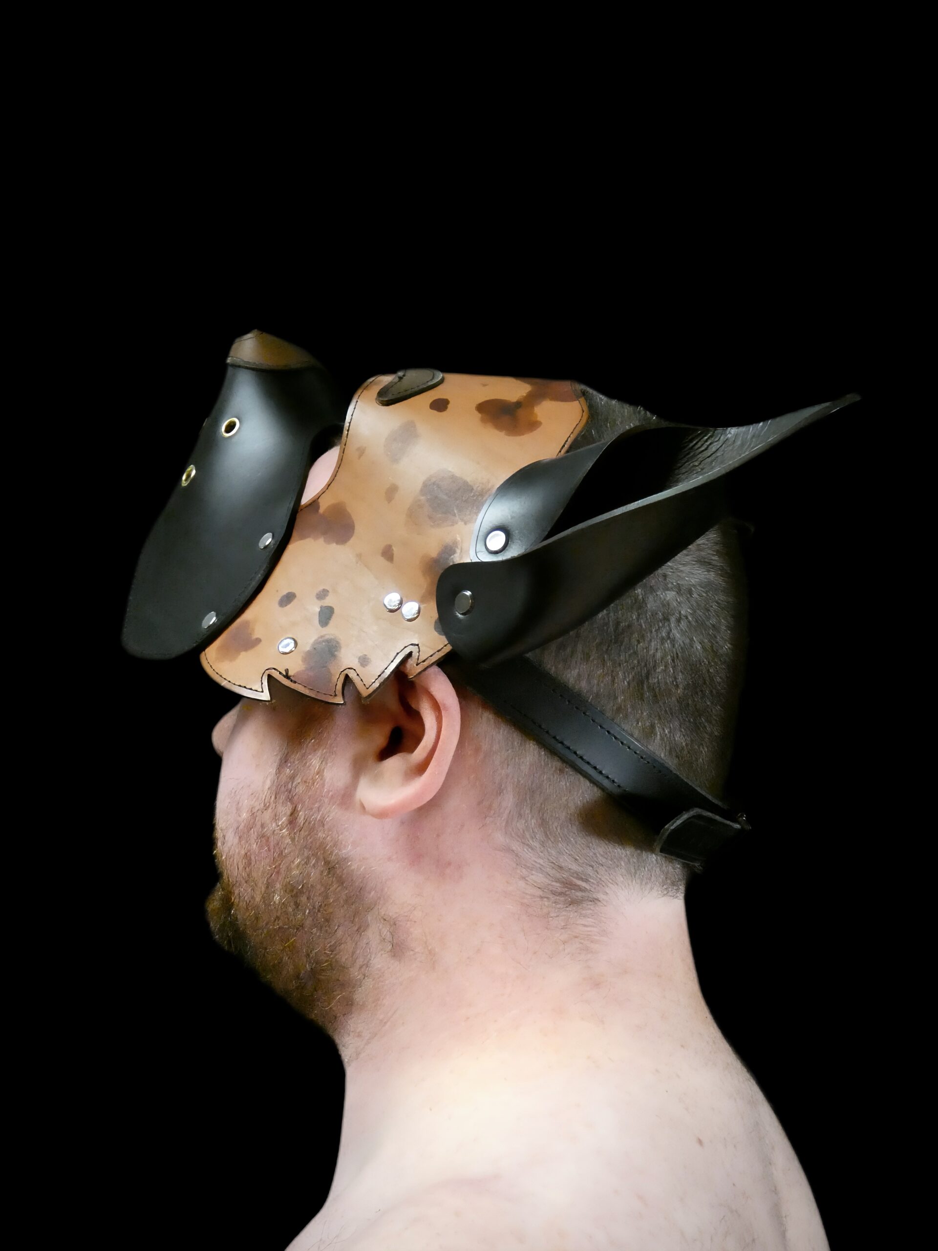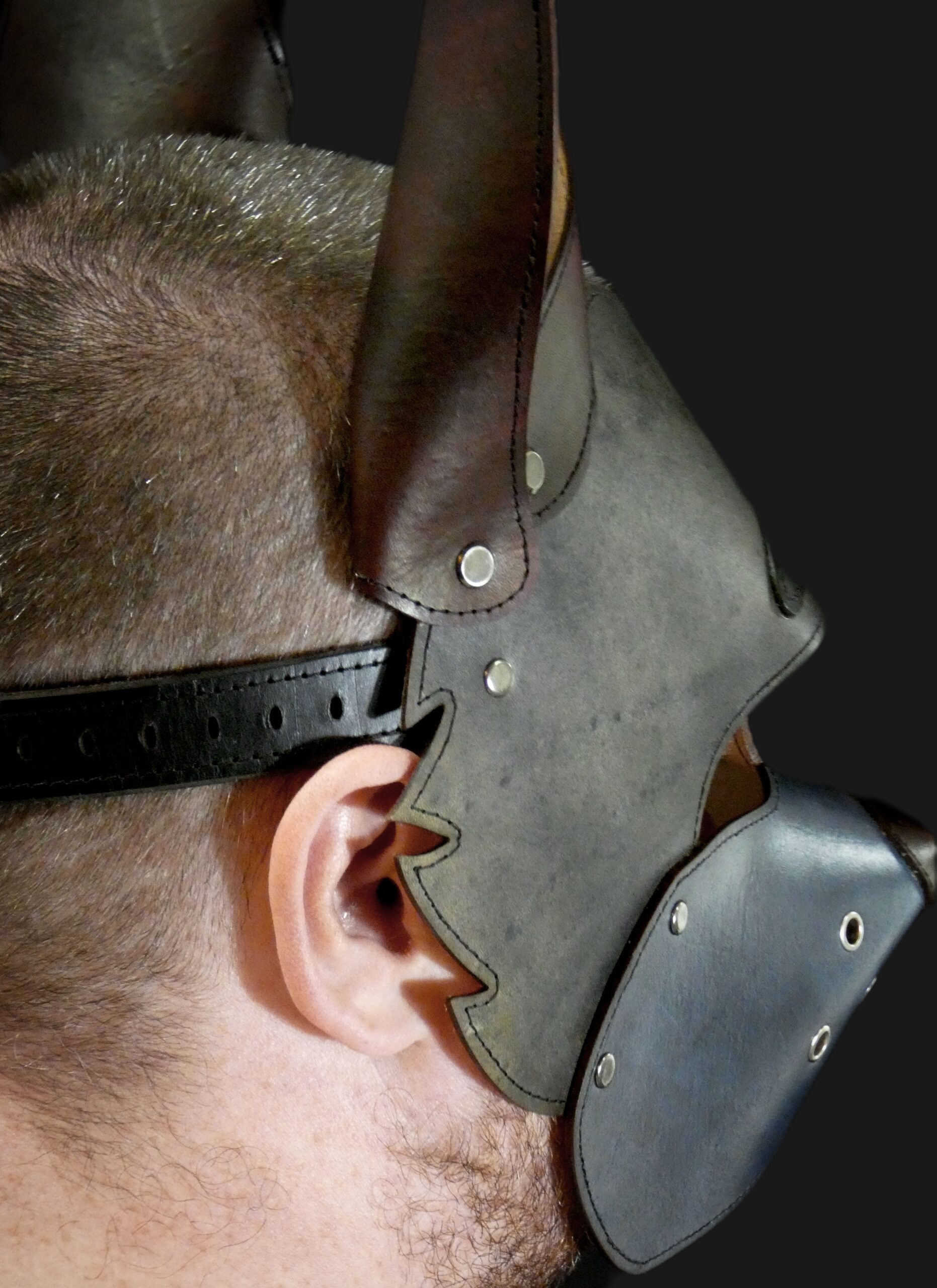 Our hoods come with a single buckled strap that lets keeps it in place whilst wearing but also lets you lift it up on your head when you want a break from all the pup play